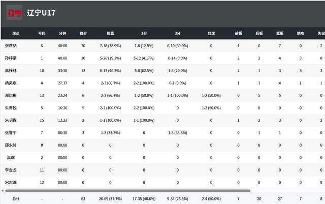 就这场比赛的数据来看,辽宁U17男篮此役只有3人得分上双,张茗喆打满40分钟,18投7中,拿到20分7篮板,孙梓豪打满40分钟,26投5中,拿到10分4篮板3助攻,高梓林13分3篮板3助攻。