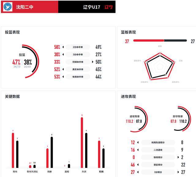 沈阳二中4人得分上双,关振博文23分12篮板,王靖贺17分3篮板,李梓儒11分2篮板,王韩10分2篮板。